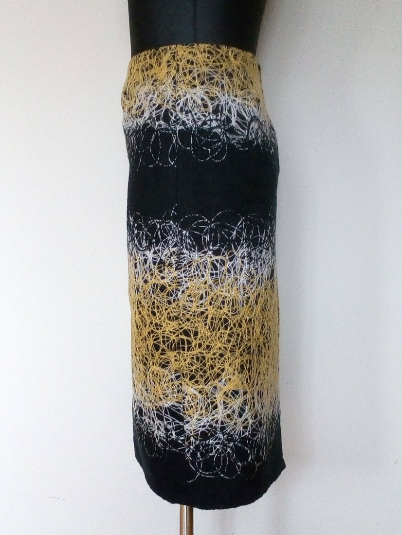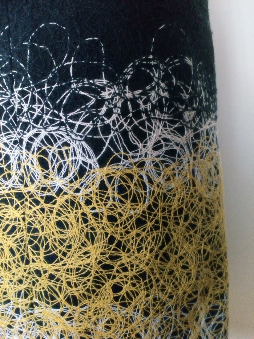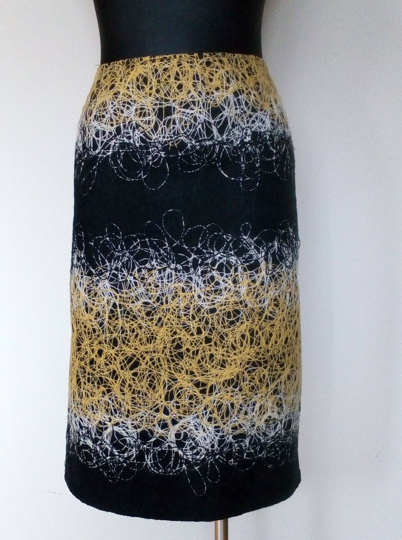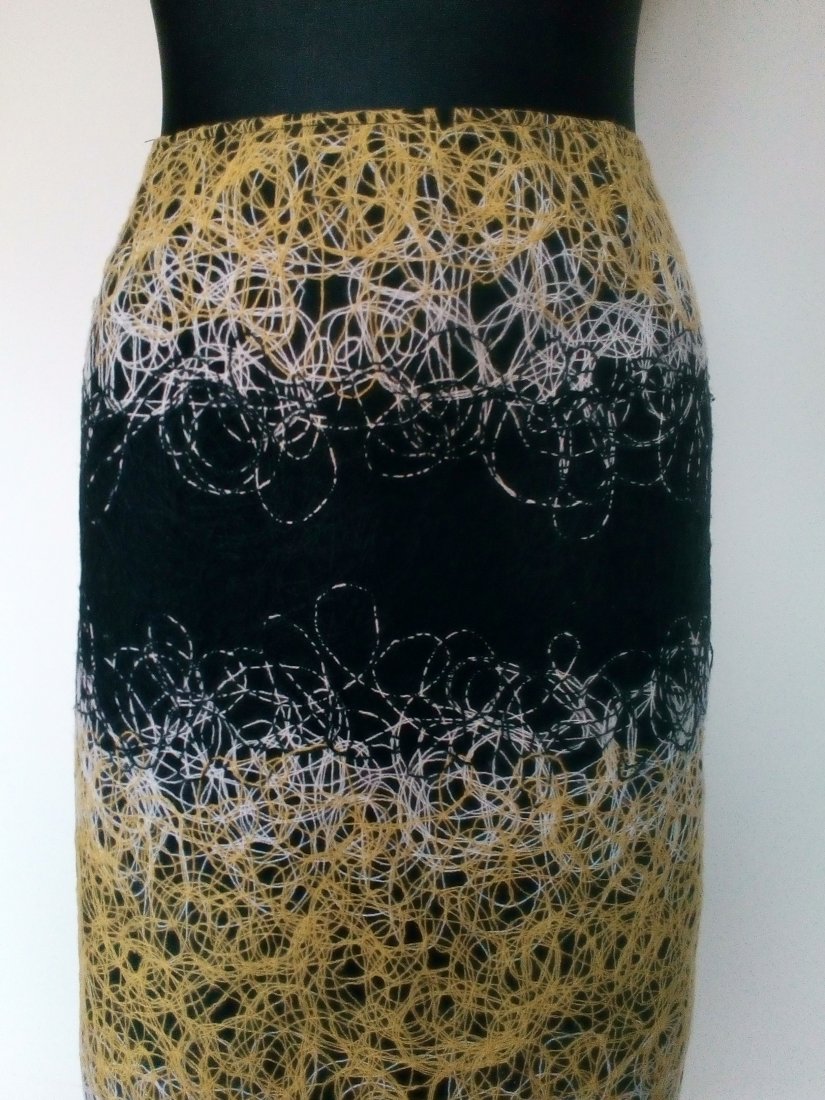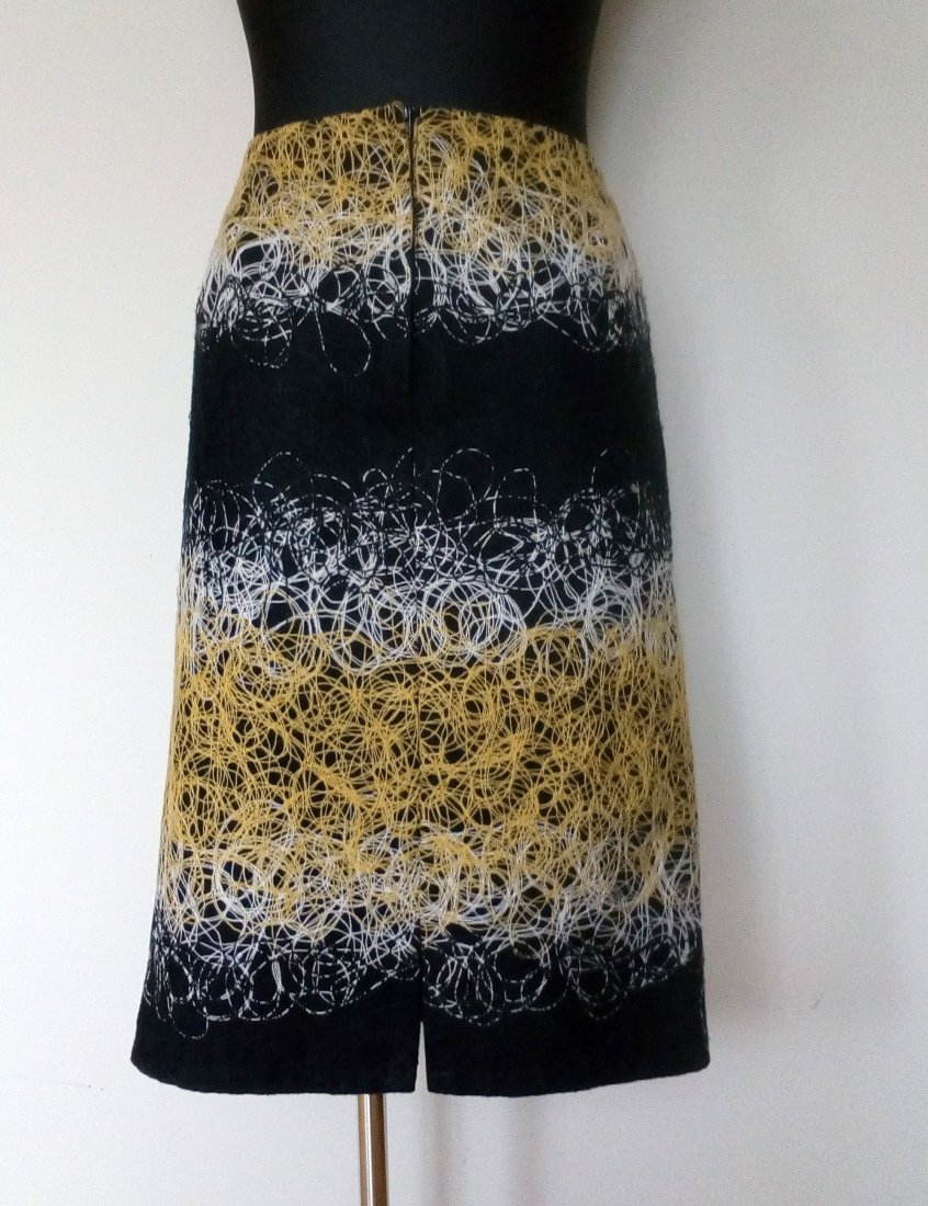 Elegancka, wełniana spódnica w czarnym kolorze z naszywanymi po górze wełnianymi nitkami w kolorach - czarny, ecru i musztardowy, u góry bez paska, od pasa dwie krótkie zaszewki z przodu dwie z tyłu, spódnica zapinana w tyle na zamek, u dołu małe rozcięcie, od sroka podszewka