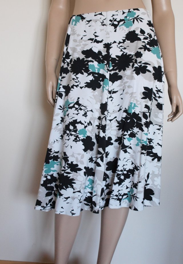 letnia spódnica marki bassini. Materiał 95% dzianina wiskozowa 5% elastan, w pasie guma. cięta z szerokich klinów, bardzo ładnie się układa. Rozmiar z metki 16, ale mniejsza, na manekinie o rozmiarze 38. stan bardzo dobry. Podaję wymiary mierzone na płasko;