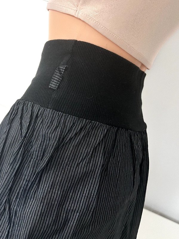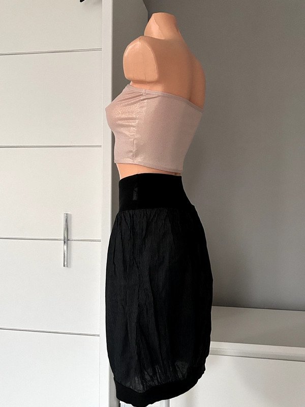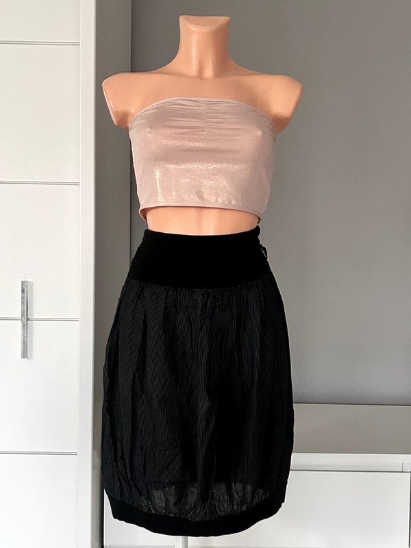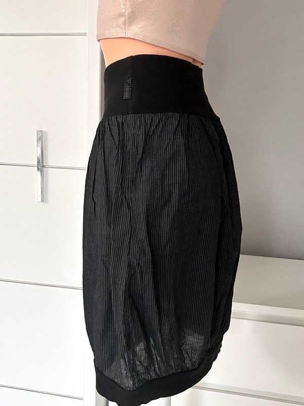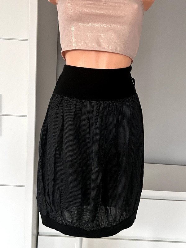 Spódnica bawełniana, przewiewna, cieniutka w delikatny prążek typu bombka. U góry i na dole ściągacz. Przy górze po bokach na ściągaczu przyszyte szlufki. Nie posiada metki ze składem i rozmiarem ale to jakieś S/M 36/38.