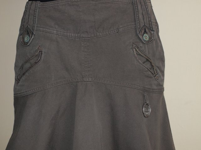 Krotka, sportowa spódnica, marki Diesel. Materiał 100% grubsza, sztywniejsza bawełna. Spódnica wąska w biodrach, od bioder cięta z półklosza. Kolor ciemnej oliwki. Stan bardzo dobry, prawdopodobnie nieużywana. Rozmiar z metki 28. Myślę że powinna pasować na 38. Podaję wymiary mierzone na płasko;