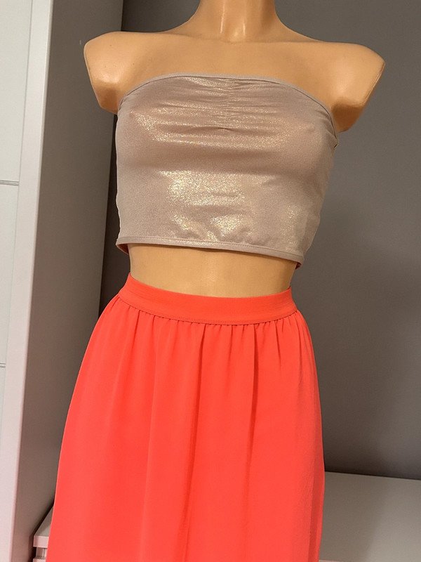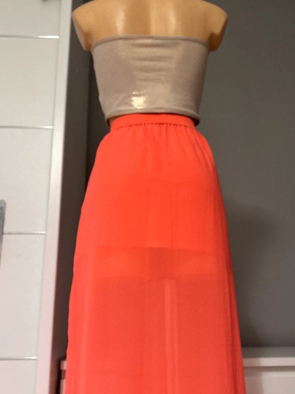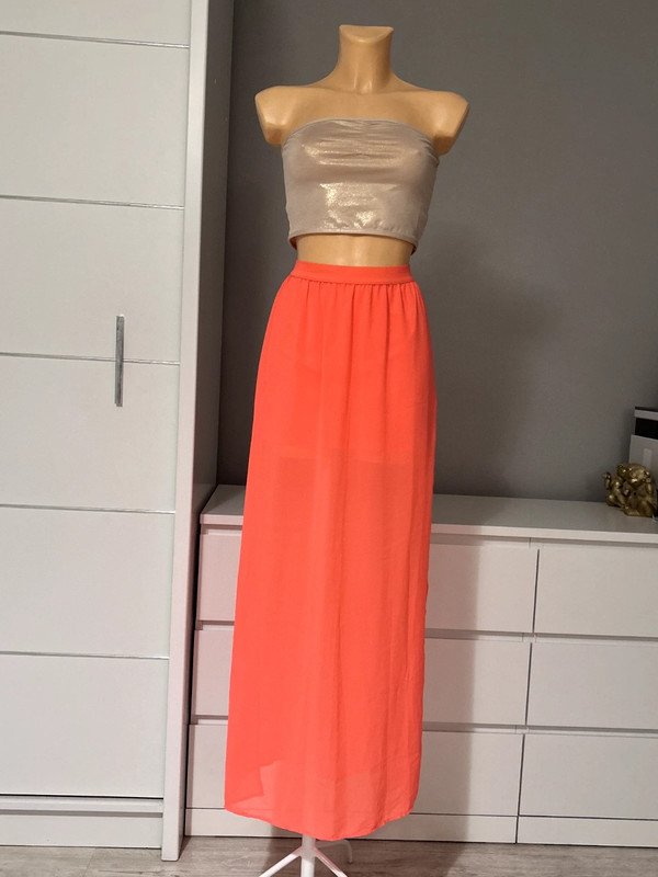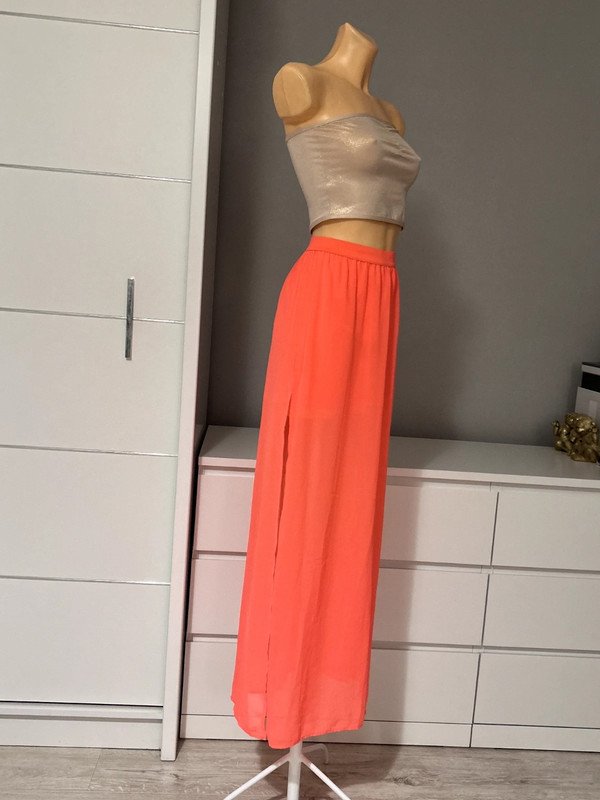 Spódniczka Długa Maxi firmy h&m divided. Kolor różowy rozmiar 36 S, rozcięcia po bokach. Wymiary podaje mierzone na płasko: pas około 32 cm( rozciąga się do 45 cm), biodra około 53 cm, długość całkowita około 101 cm. Spódniczka posiada halkę.