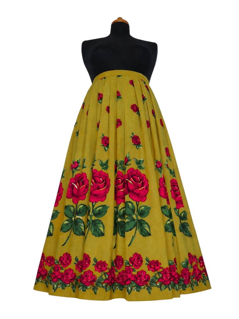 Spódnica folkowa z zakładkami, zdobiona klasycznym wzorem czerwonych róż inspirowanym folklorem góralskim i karpackim.