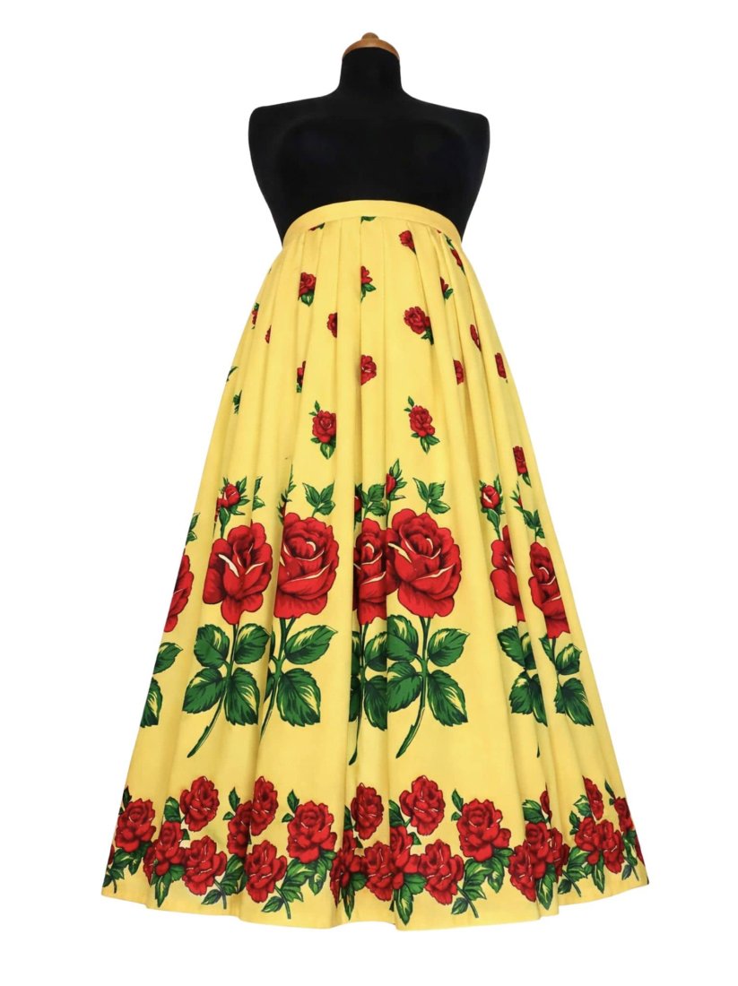 Spódnica folkowa z zakładkami, zdobiona klasycznym wzorem czerwonych róż inspirowanym folklorem góralskim i karpackim.