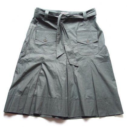 Spódnica w kolorze khaki z zakładkami, z przodu dwie kieszonki. Z boku suwak. W pasie można mozna dodatkowo przewiązać. Rozmiar 38; dł. 62 cm, obwód w pasie 78 cm. Marka Kookai. Stan bardzo dobry.