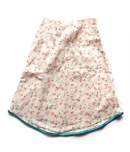 Spódnica z cieniutkiej , przewiewnej bawełny (chyba batyst), w drobny kwiatowy rzucik. Kolorystyka- tło kremowe, kwiatuszki róż i zieleń olwkowa. Szyta na jasnoróżowej podszewce. Wykończona turkusowo-szmaragdową lamówką. Zapinana na suwak z boku. Rozmiar z metki M, 38. W pasie 41 cm x2; dł. 58 - 65 cm. Stan idealny, jak nowa.
