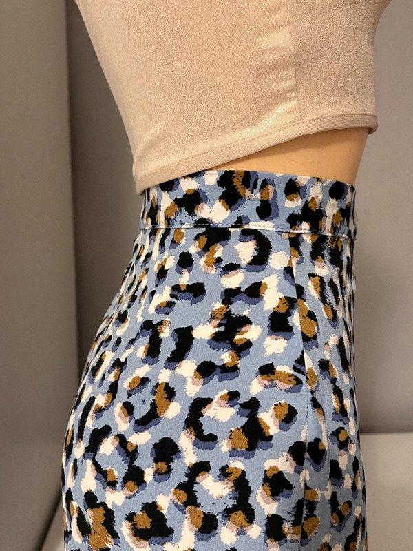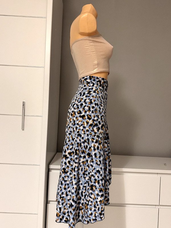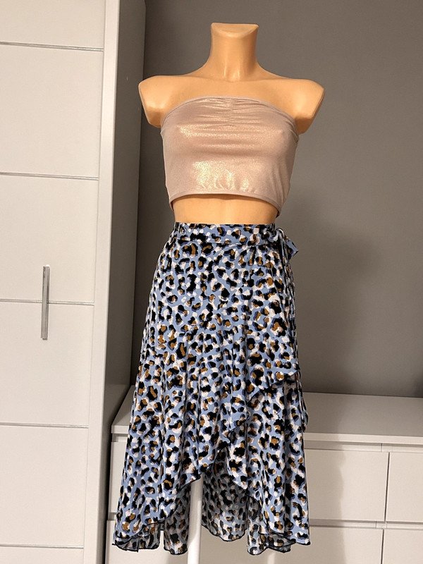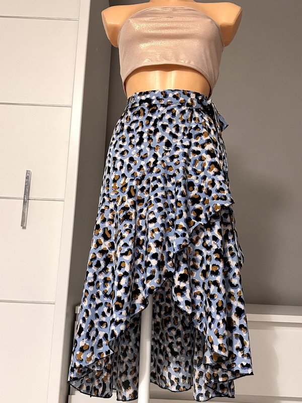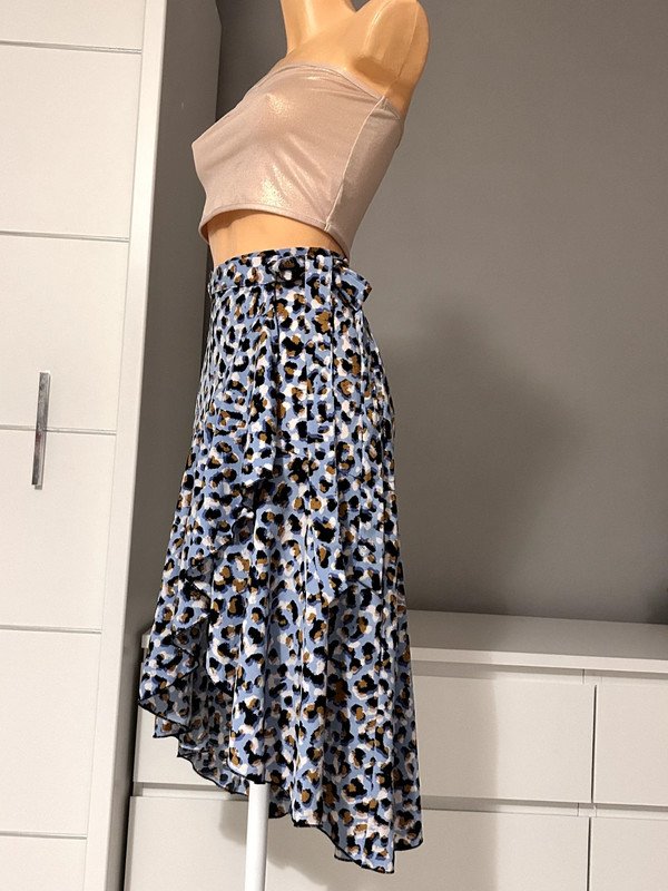 Spódnica midi w panterkę niebiesko beżowo kremową, firmy Lindex. Rozmiar XS 34. Zakładana, asymetryczna, krótsza z przodu, wiązana z boku.