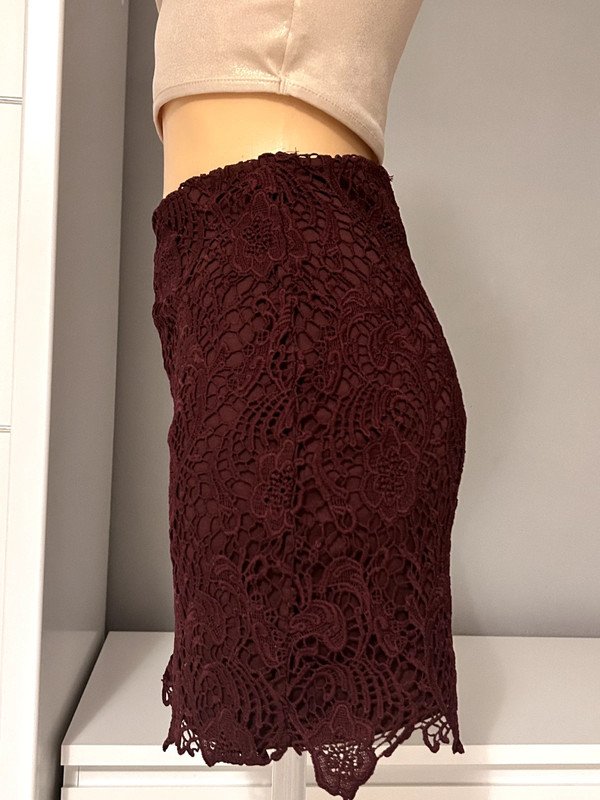 Krótka spódniczka mini, krótka firmy H&M Divided, rozmiar XS 34. Elastyczna wygodna z koronki, kolor bordowy, burgundowy. Z tyłu zasuwana na zamek. Wymiary podawane na płasko: