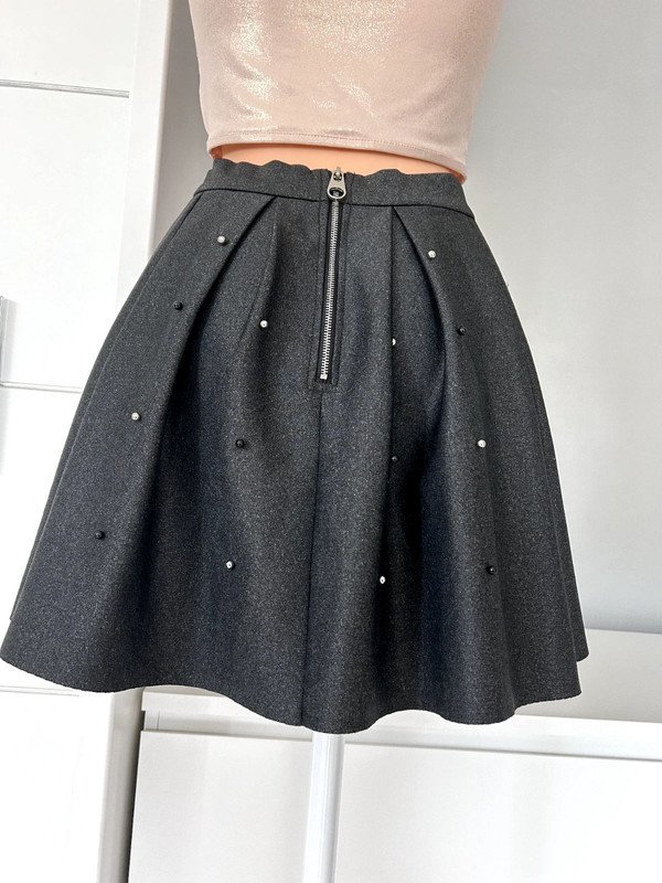 Spódnica mini firmy Sinsay, rozmiar XS 34. Rozkloszowana, ozdobiona gustownie perełkami. Na pasku, z tyłu ozdobny zamek. Kolor ciemny szary melanż, elastyczny materiał. Polecam