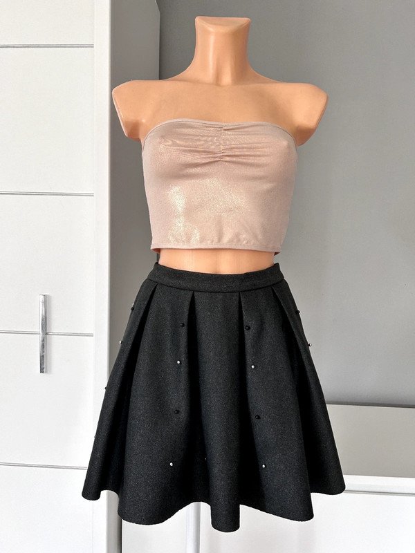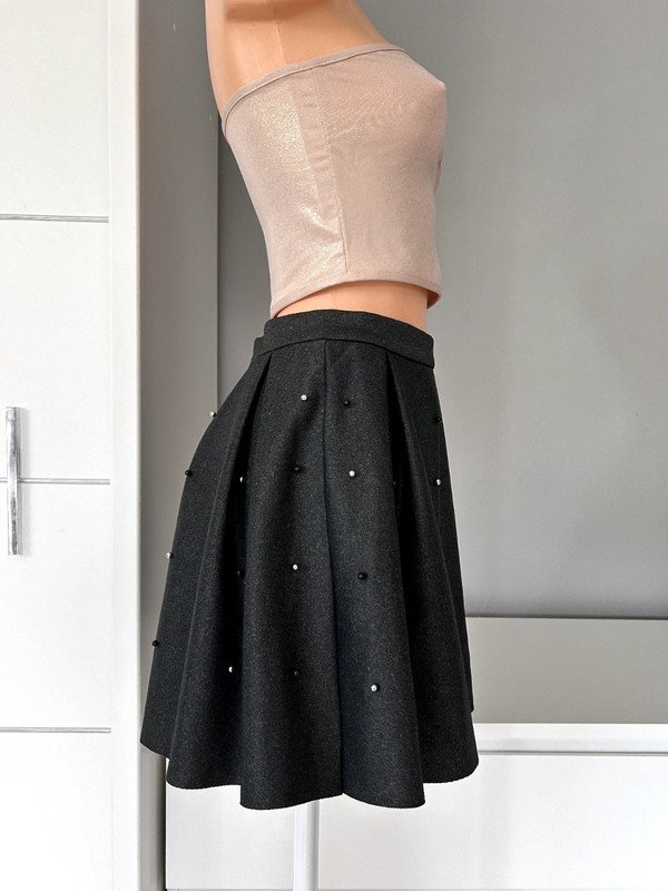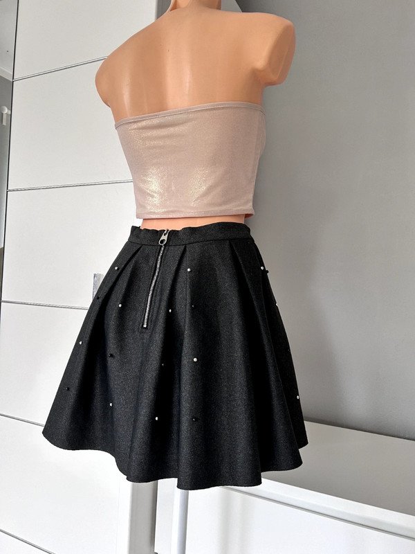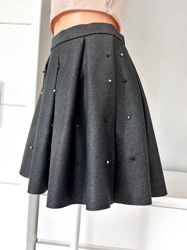 Spódnica mini firmy Sinsay, rozmiar XS 34. Rozkloszowana, ozdobiona gustownie perełkami. Na pasku, z tyłu ozdobny zamek. Kolor ciemny szary melanż, elastyczny materiał. Polecam