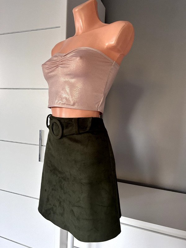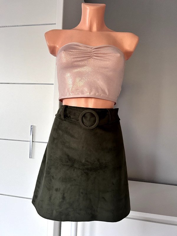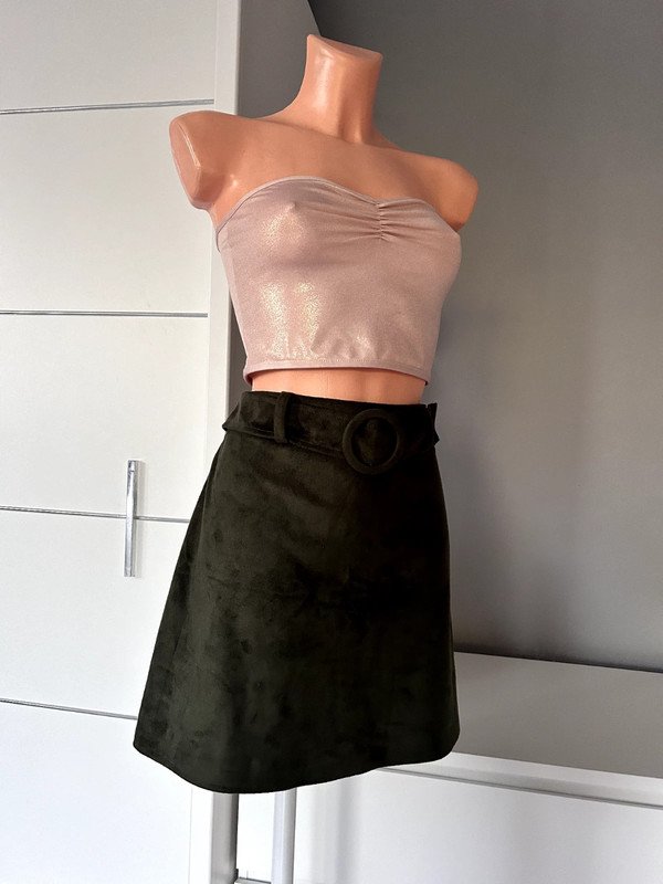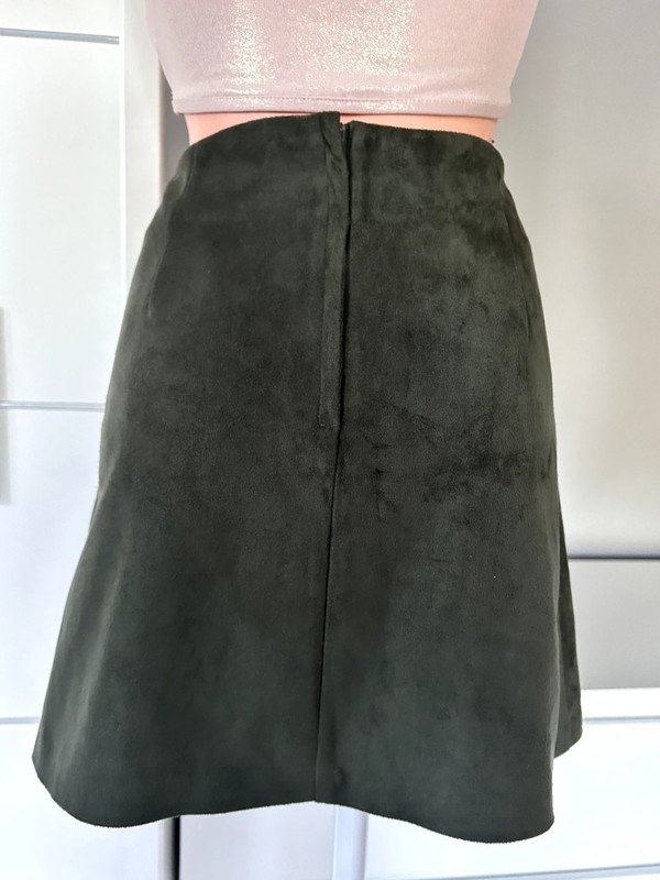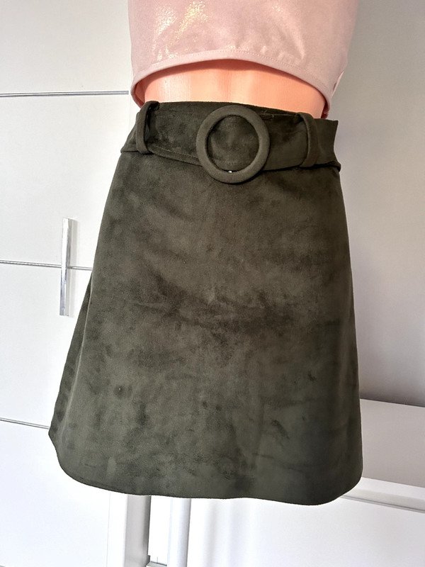 Spódnica firmy Primark w rozmiarze 40 L, kolor khaki ciemno - zielony. Materiał a'la zamsz, trapezowy krój. Możliwość regulacji w pasie za pomocą paska z ozdobną okrągłą klamrą, z tyłu zasuwana na zamek. Szafa kapsułowa, old money style. Polecam