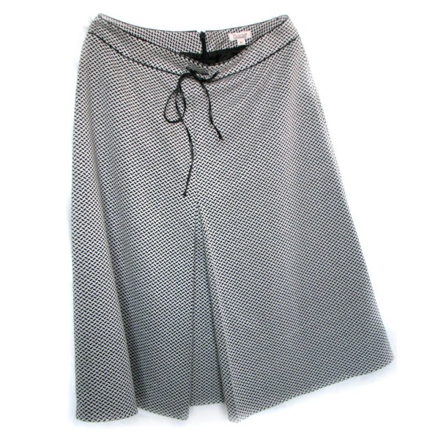 Spódnica na podszewce o kroju A z założeniem na przodzie, pasek wykończony skórzaną lamówką ze skórzanymi sznureczkami wiązanymi w pasie. Wymiary na płasko: talia 37 cm (zamek z tyłu), biodra 50 cm, długość 62 cm.