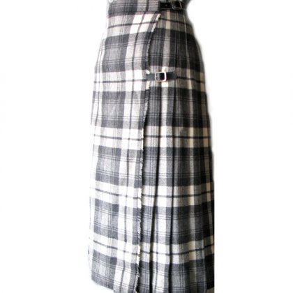 Spódnica szkocka nie tylko poprzez krój i wygląd, ale również przez pochodzenie :) Wykonana w Szkocji. Spódnica na pasku w kolorze szarym, z kontrafałdami po bokach i z tyłu. Bardzo kobieco podkreśla kształty. Zapinana bardzo ciekawie, na sprzączkę. Wymiary na płasko: talia 35 cm, biodra 48 cm, długość 70 cm.