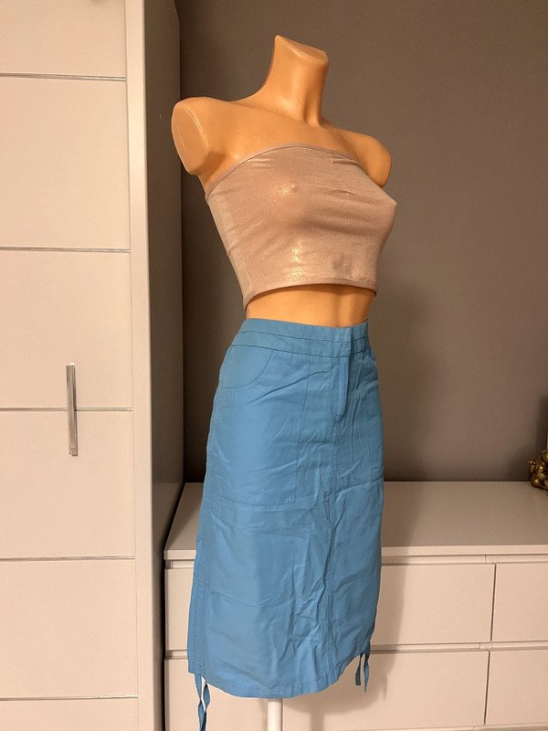 Spódnica Topshop Moto rozmiar 38 m. Dopasowana, możliwość przyciągnięcia boków i skrócenia długości. Kolor niebieski, 54% bawełna.