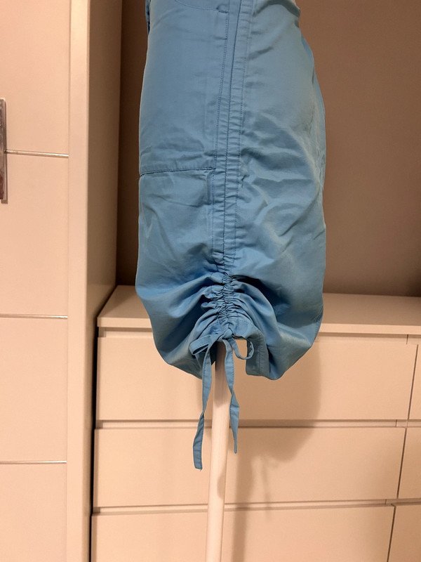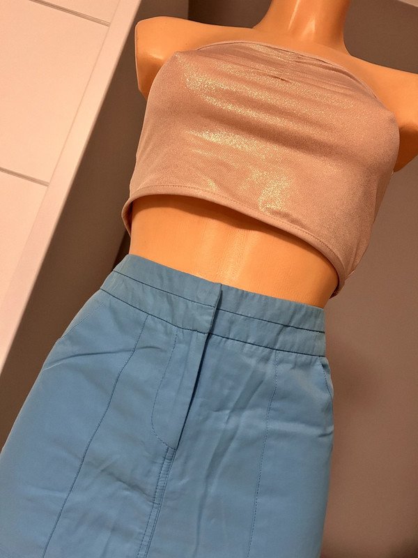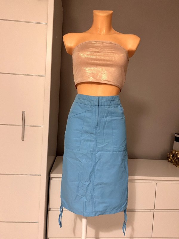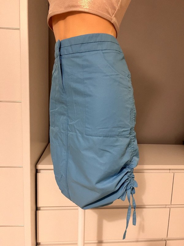 Spódnica Topshop Moto rozmiar 38 m. Dopasowana, możliwość przyciągnięcia boków i skrócenia długości. Kolor niebieski, 54% bawełna.