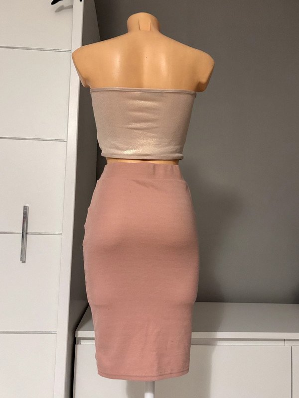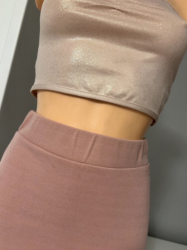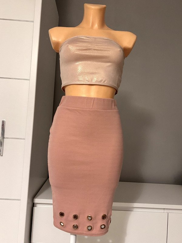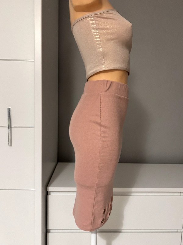 Spódniczka tuba, tubka, dopasowana, elastyczna, firmy Amisu w rozmiarze 34 XS. W kolorze pudrowego różu, za kolano, na dole ozdobne wycięcia.