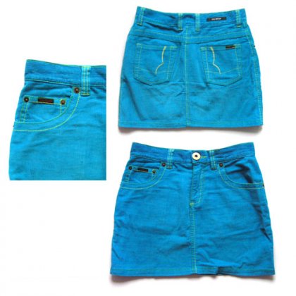 Spódnica ze sztruksu w kolorze turkusowym, przeszycia w kolorze żółtym i zielonym. zapinana na suwak i guzik, 3 kieszonki z przodu i dwie z tyłu, szlufki. Marka Cool Industry. Rozmiar s. Stan bardzo dobry, jedynym mankamentem jest małe przebarwienie na dole ( kreska dł. 3 cm). Dł. 37 cm, szer. u góry 37 cm.
