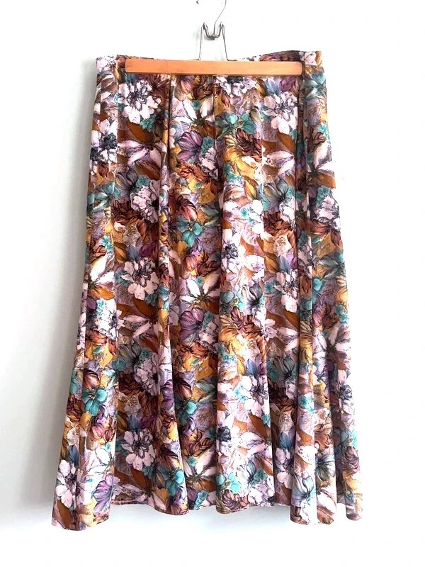 Piękna spódnica vintage w kwiaty w pastelowych kolorach. Rozkloszowany fason, lekka i kobieca. Idealna do stylizacji retro, boho i vintage. Bardzo efektowny print.