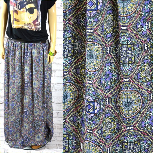 Spódnica w wersji maxi w witrażowe printy, spódnica lekka , o poszerzanym kroju, z przodu po bokach rozcięcia, w pasie na gumce z eco skóry.