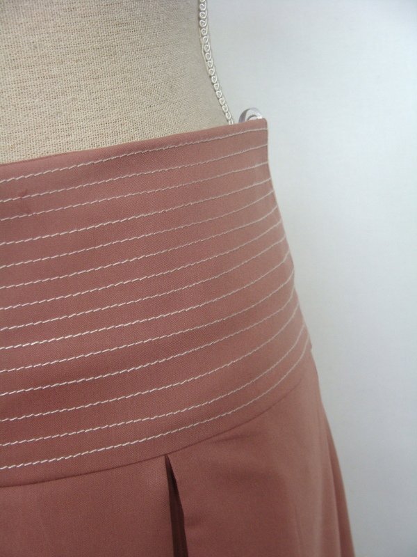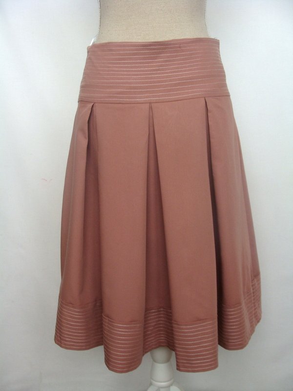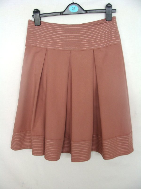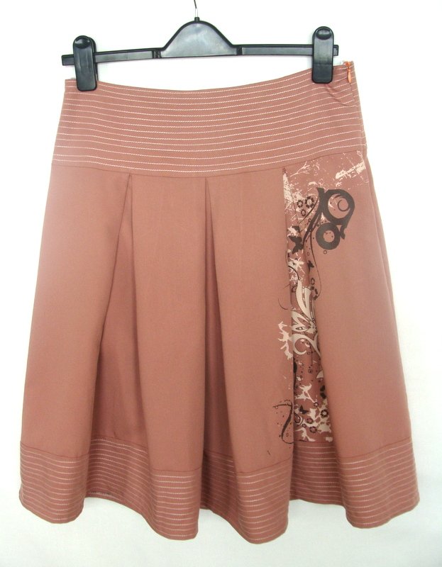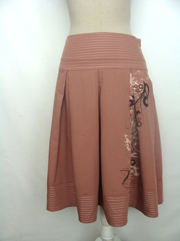 Zgrabna spódniczka w łososiowym kolorze z nadrukiem kwiatowym z jednego boku. Na przeszywanym ozdobnie szerszym pasku w talii , z kontrafałdami, ozdobne przeszycia również na doszywanej plisie u dołu spódnicy. Zapinana z boku na zamek . Całość na podszewce