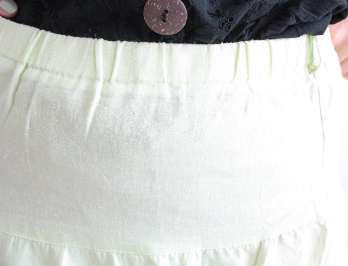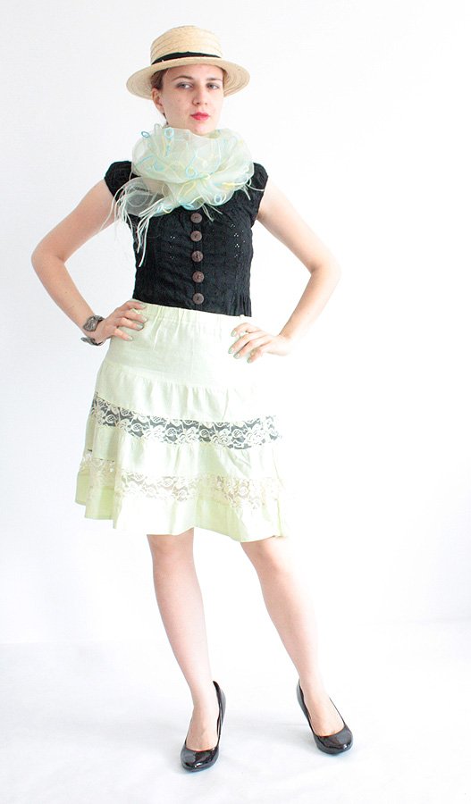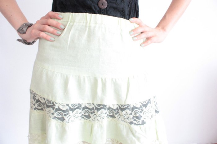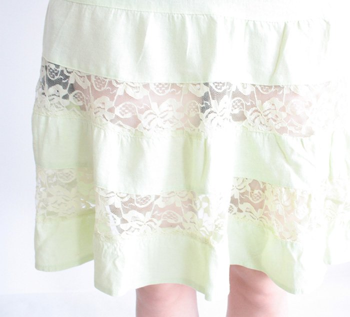 Pistacjowa spódnica ozdobiona pasami z koronki. W talii wszyta gumka.