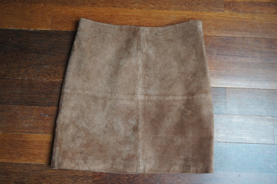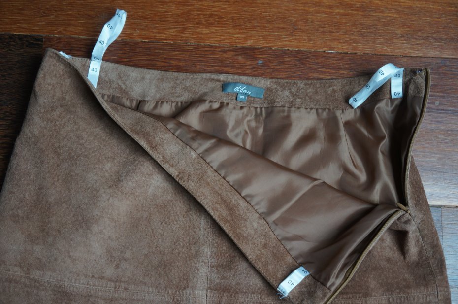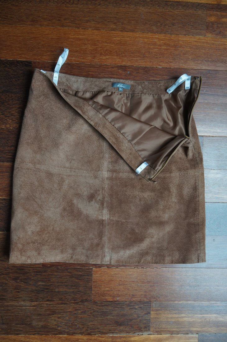 Spódnica zamszowa w kolorze brązowym. Na podszewce. Z boku zapinana na kryty suwak i guzik. Długość przed kolano. Stan bardzo dobry.