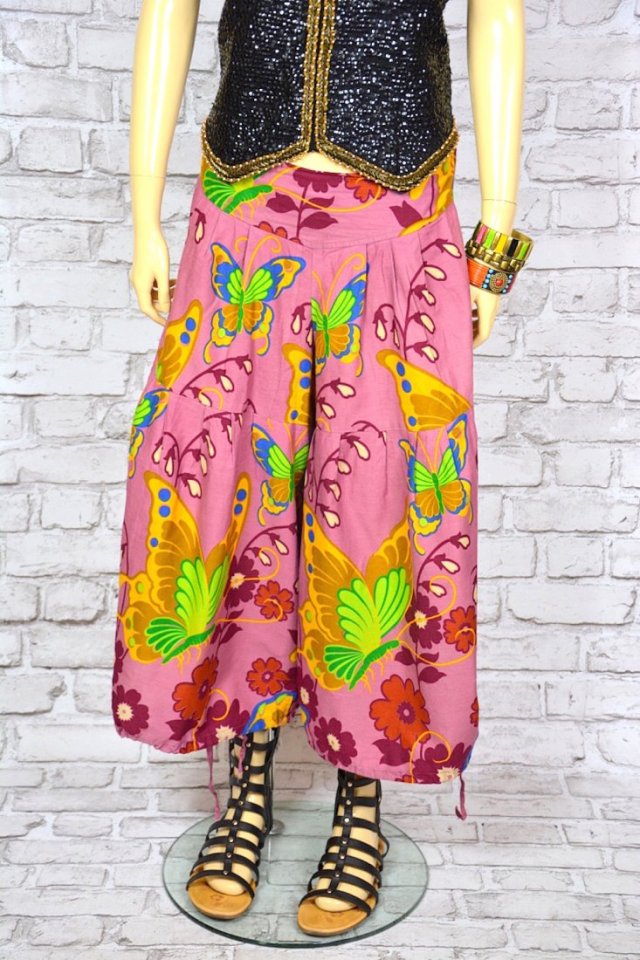 Unikatowe kolorowe spódnico-spodnie o luźnym kroju do około połowy łydki, w pasie na gumce, nogawki dość szerokie do dołu mocno poszerzane i przy końcach dodatkowo wiązane. Można nosić jako spódnice: wtedy nogawki u dołu zostawiamy przy maksymalnej szerokości, jeśli mają być spodnie ( w stylu alladynek )wystarczy spodnie u dołu ściągnąć sznurem i zawiązać. Wykonane z solidnej , doskonale trzymającej fason bawełny.