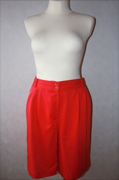 spódnicospodnie vintage w kolorze różu wpadającego w czerwony, nogawki z mankietami, dwie kieszenie, w pasie gumka, zapinane na suwak i trzy guziki