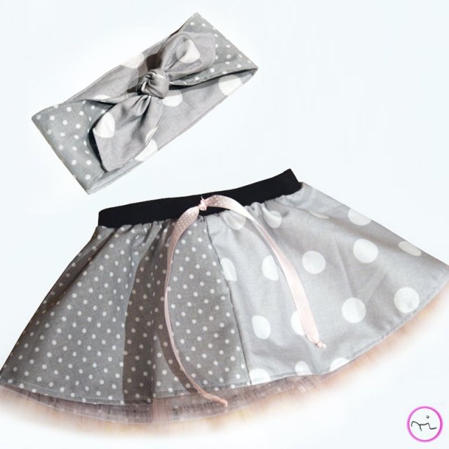 Śliczna spódniczka dla małej księżniczki wykonana została z szaro-białej bawełny. Z czarną gumką w pasie oraz różowym tiulem. Ze spódniczką dodatkowo kokarda na główkę wykonana z tego samego materiału. Spódniczka szyta na wymiar (w zmówieniu proszę podać obwód w pasie oraz obwód główki).