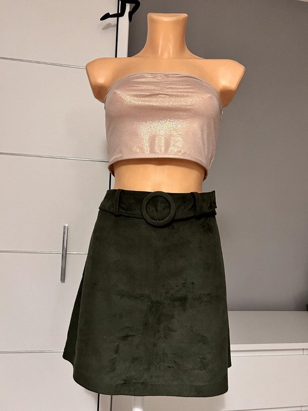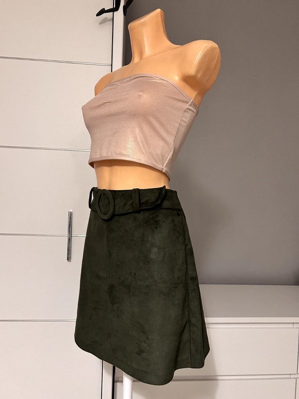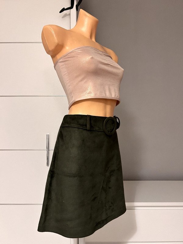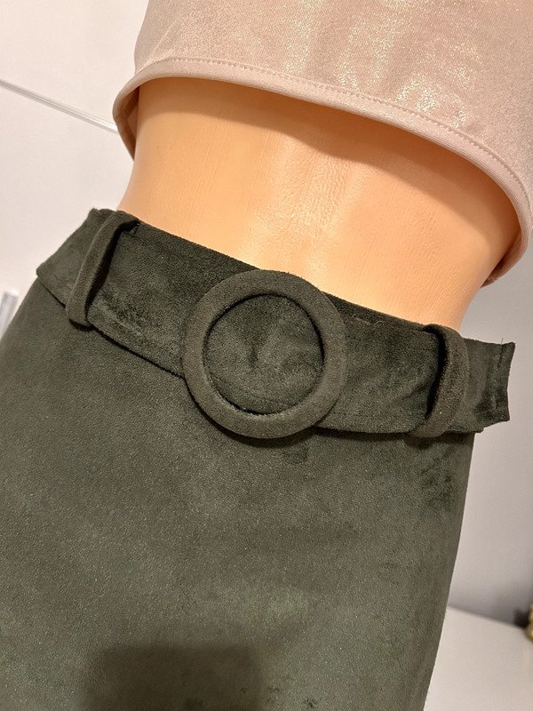Spódniczka mini firmy Primark, rozmiar L40. Kolor ciemnozielony tak zwana zgnita zieleń. Z przodu w talii pasek, materiał a la zamsz bardzo przyjemny w dotyku. Trapezowy krój, możliwość regulacji w pasie za pomocą paska z ozdobną okrągłą klamerką przecinek z tyłu zasuwane na zamek. Wymiary podaje mierzone na płasko: pas około 38 cm x 2, biodra około 52 cm x 2, długość całkowita około 42 cm.