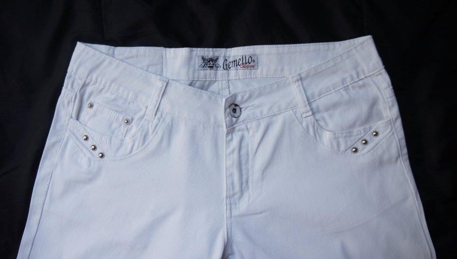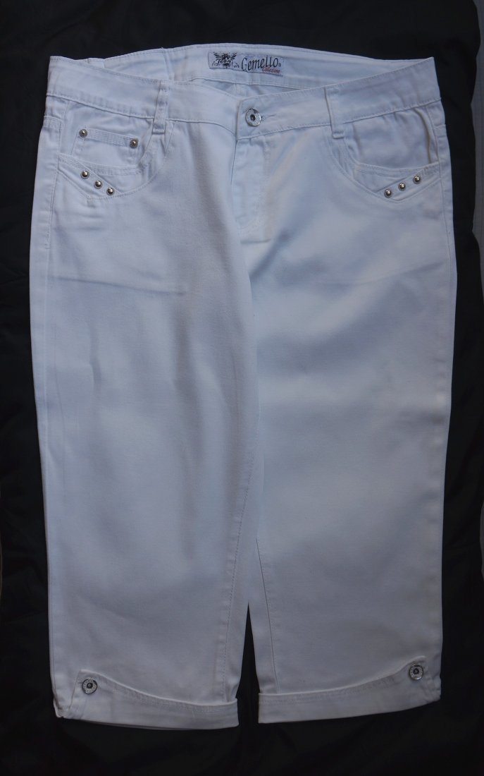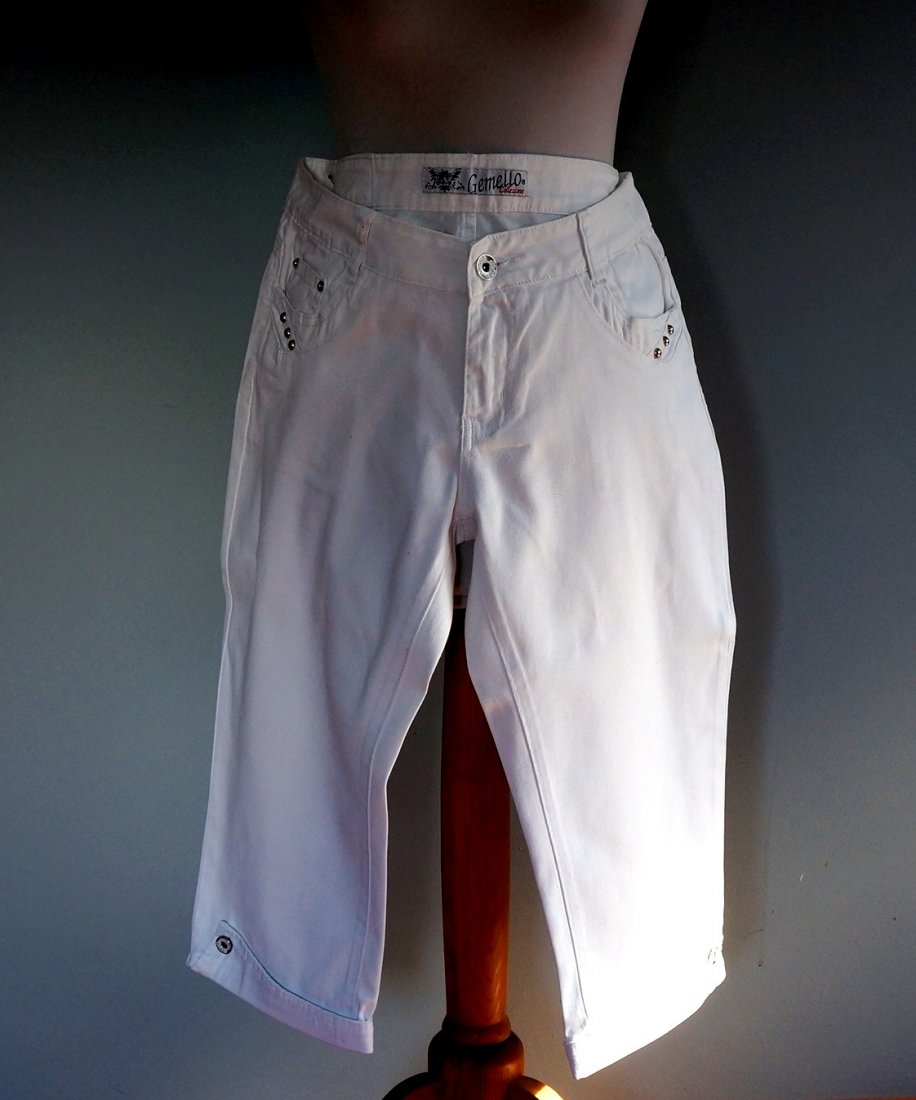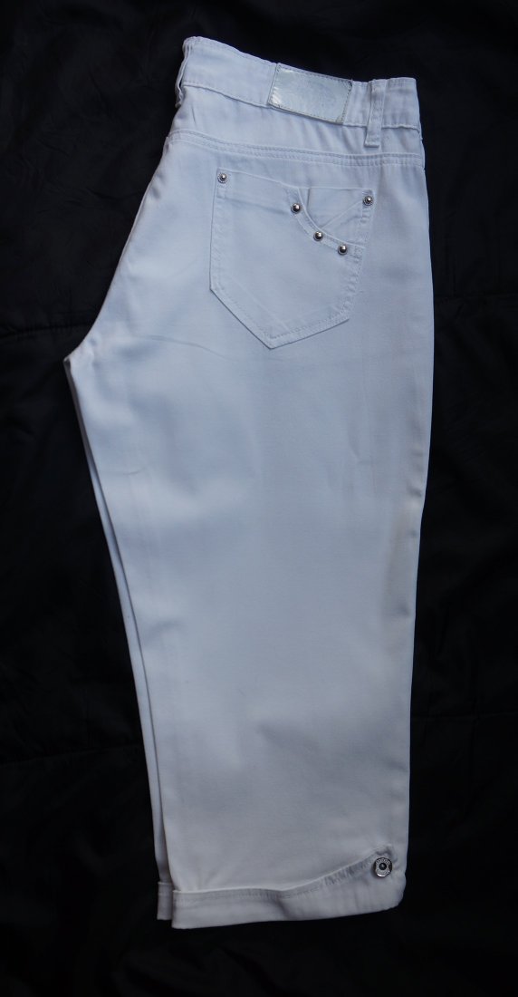 Białe spodnie o długości ¾. Nogawki zakończone mankietem. Zapinane na guzik i kryty zamek. Z przodu dwie wpuszczone kieszenie. Z tyłu dwie kieszenie naszyte. Tkanina - 95% bawełna, 5% lycra. Stan bardzo dobry.