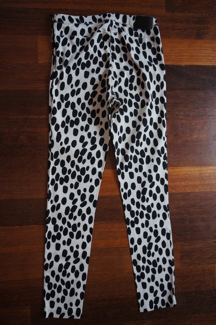 Spodnie marki H&M. Biało-czarne. Z boku zapinane na suwak (długość 17 cm). Nogawki zwężane ku dołowi. Tkanina lekko rozciągliwa - bawełna z elastanem. Stan bardzo dobry.