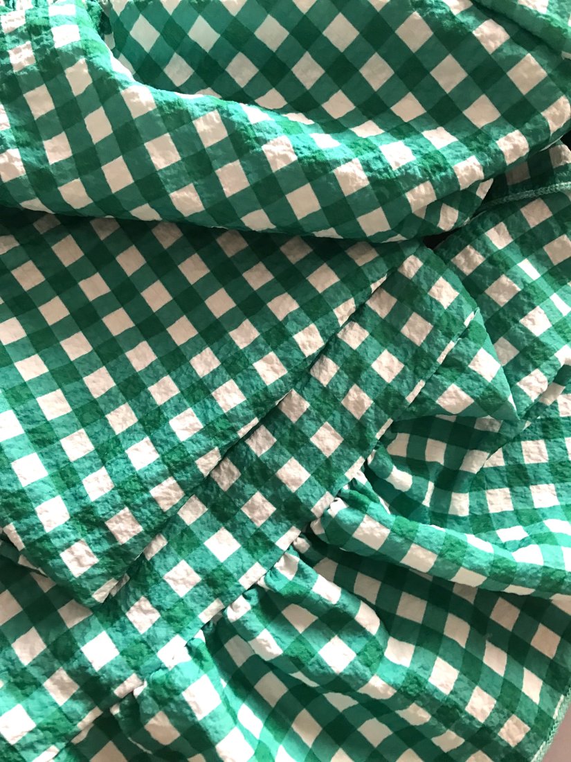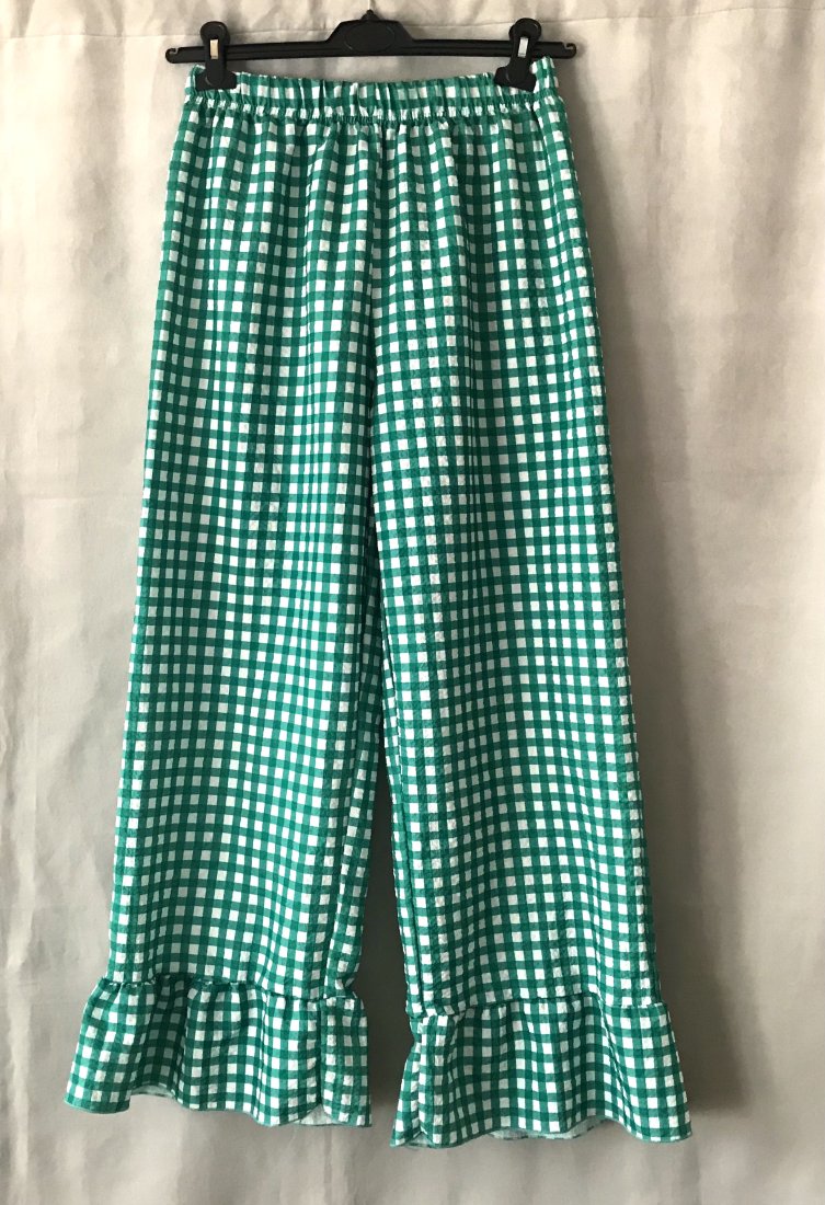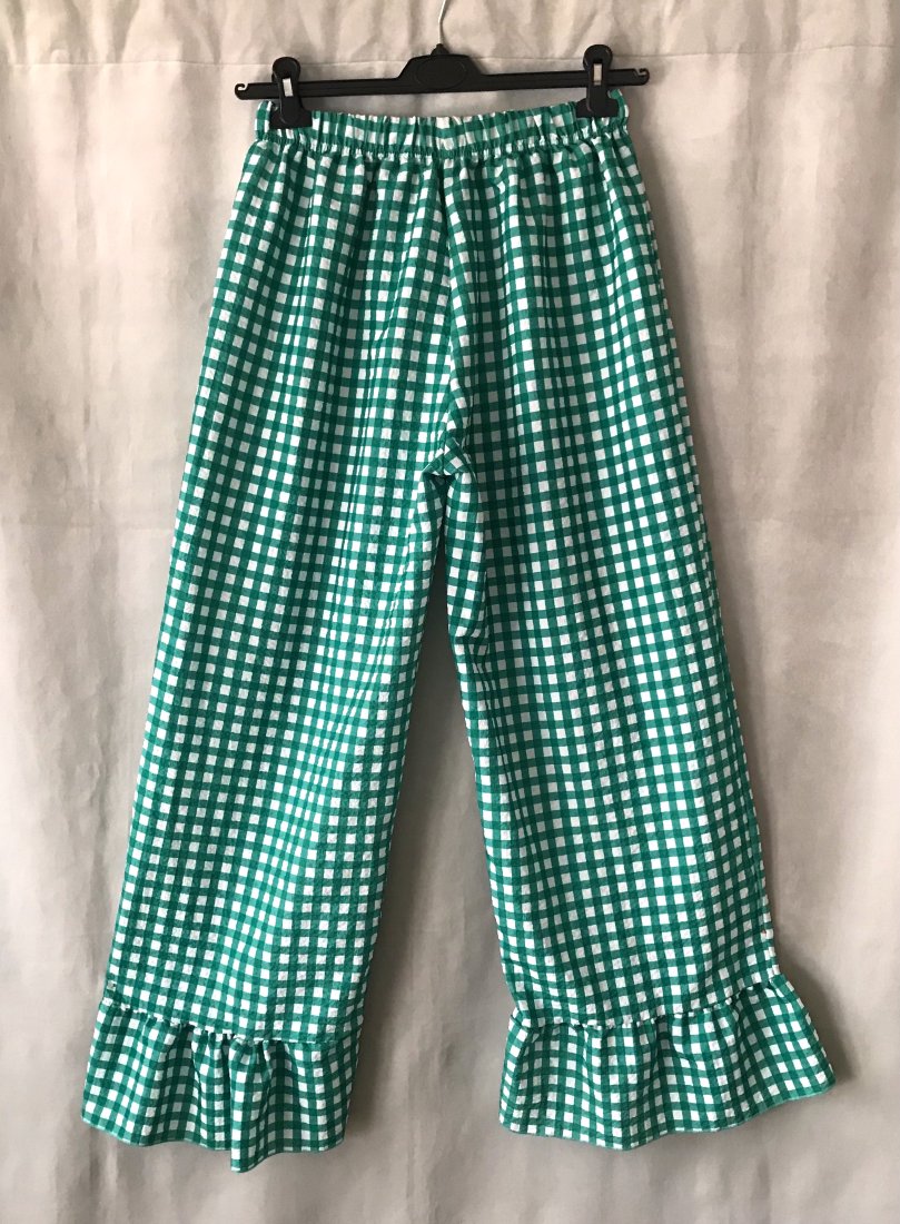 Polecam świetne spodnie wykonane z kreszowanej tkaniny w zieloną kratę. Fason luźny , dół wykończony falbanką w pasie wszyta gumka. bawełna wymiary; pas; 74/94 cm biodra; do 120 cm udo; szerokość 39 cm długość od pasa; 105 cm od kroku; 76 cm