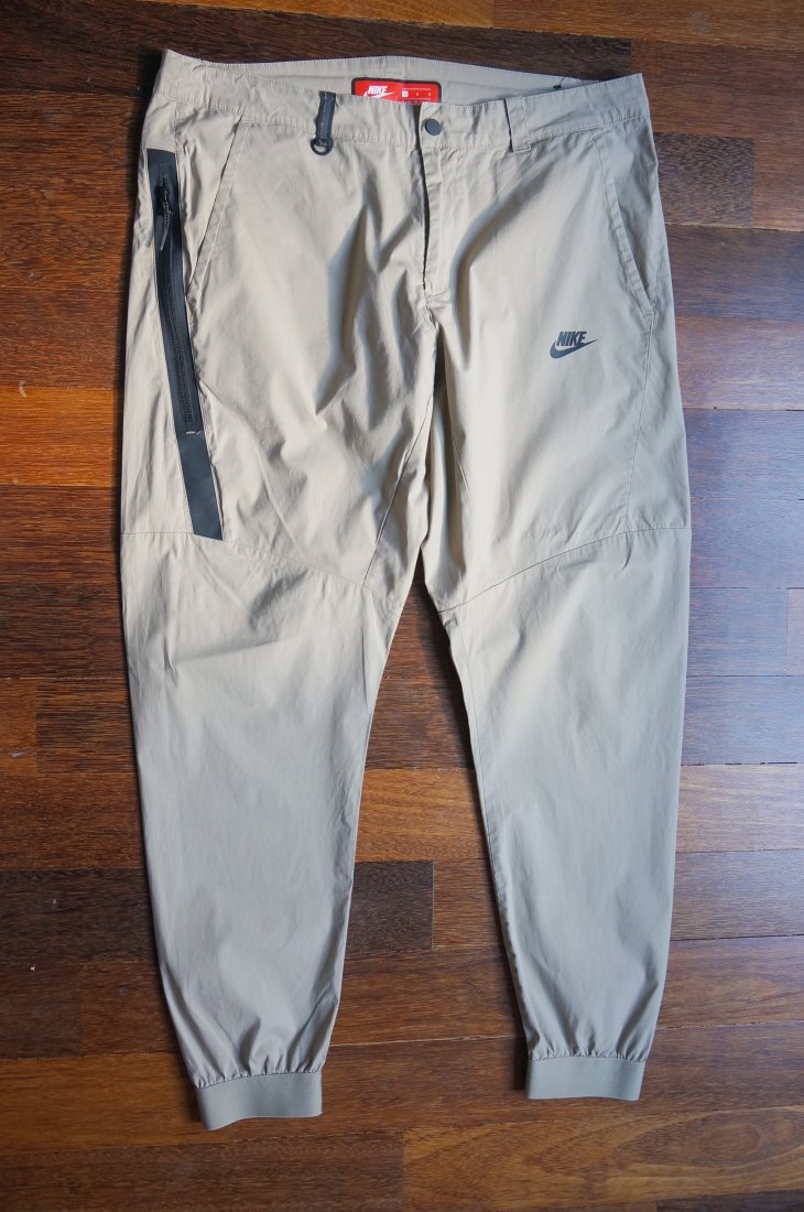 Męskie spodnie marki Nike. Kolor beżowy. Zapinane na suwak i nap. Z przodu dwie wpuszczone kieszenie. Z boku głęboka, wpuszczona kieszeń z przegródką na telefon - zapinana na suwak. Z tyłu jedna wpuszczona kieszeń zapinana na kryty suwak. Długi stan. Tkanina cienka - 96% bawełna, 4% elastan. Spodnie wiosenno-letnie. Nogawki zwężane ku dołowi, zakończone ściągaczem. Spodnie nie są nowe. Stan BDB minus.