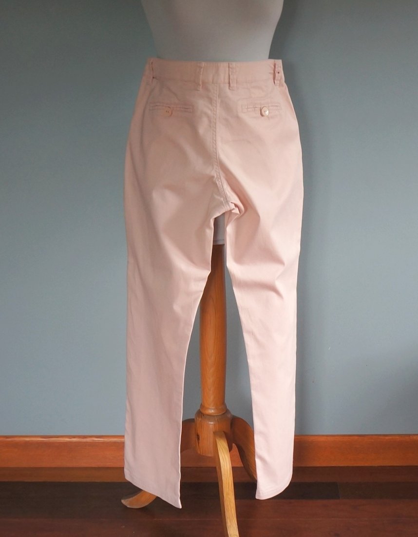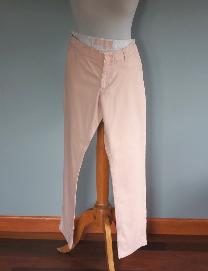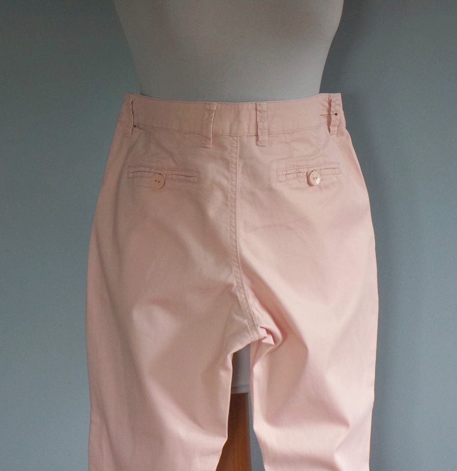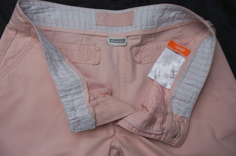 Spodnie bawełniane marki STREET ONE OLIVIA. Kolor - delikatny odcień różu. Zapinane na guzik i krótki (10 cm) plastikowy suwak. Z przodu dwie wpuszczane kieszenie. Tkanina - 98% bawełna, 2% elastan. Nie są nowe. Stan dobry - bez wad.