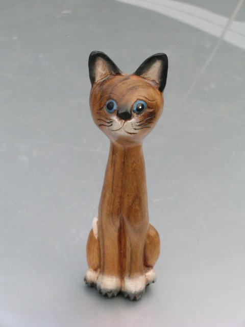 Duża uroczo kocia figurka z drewna egzotycznego, ręcznie wykonana i malowana. Przyjemna grafika słojów i nieodparty urok... i to spojrzenie :) Wysokość 20,5; szer. 6 cm. Satynowe wykończenie. Stan zachowania bardzo dobry.