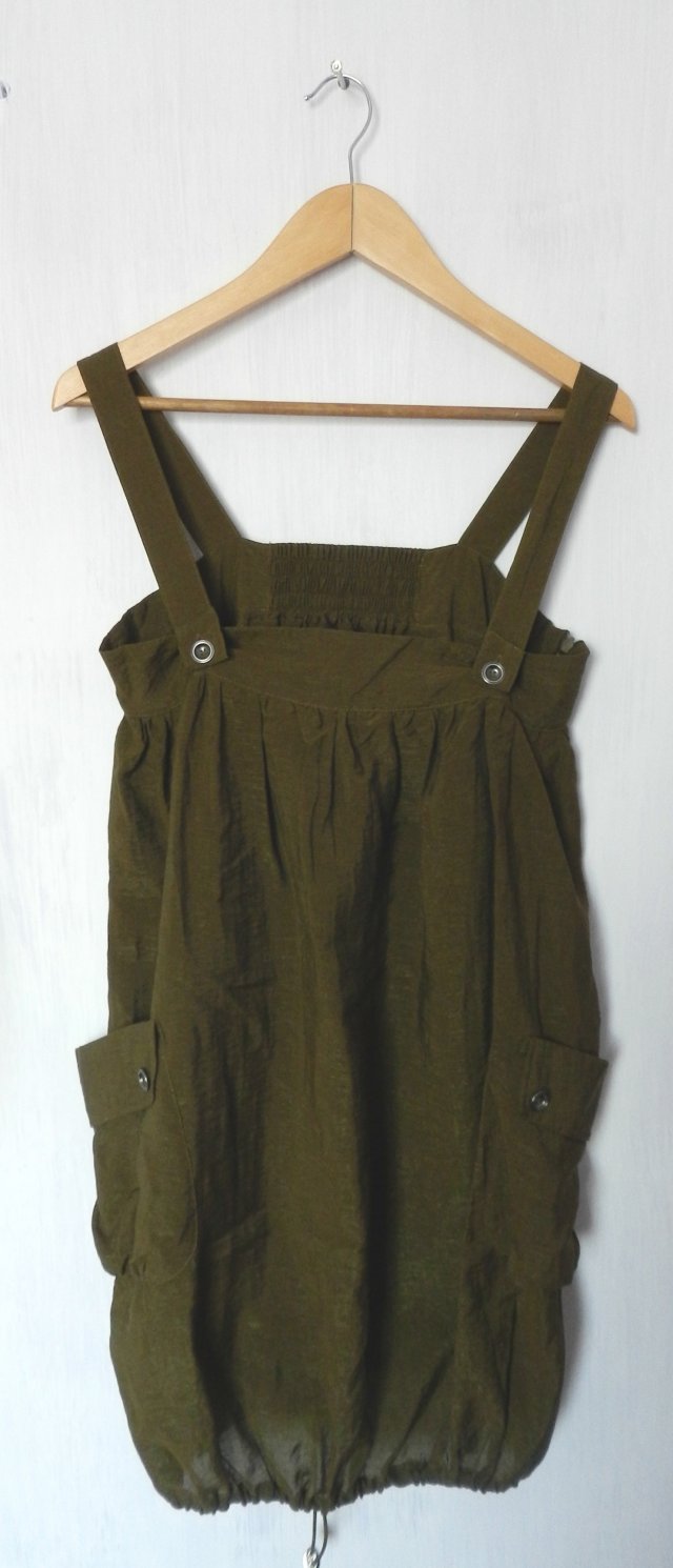 Sukienka khaki o fasonie bombki ściąganej z tyłu u dołu za pomocą sportowego sznurka
