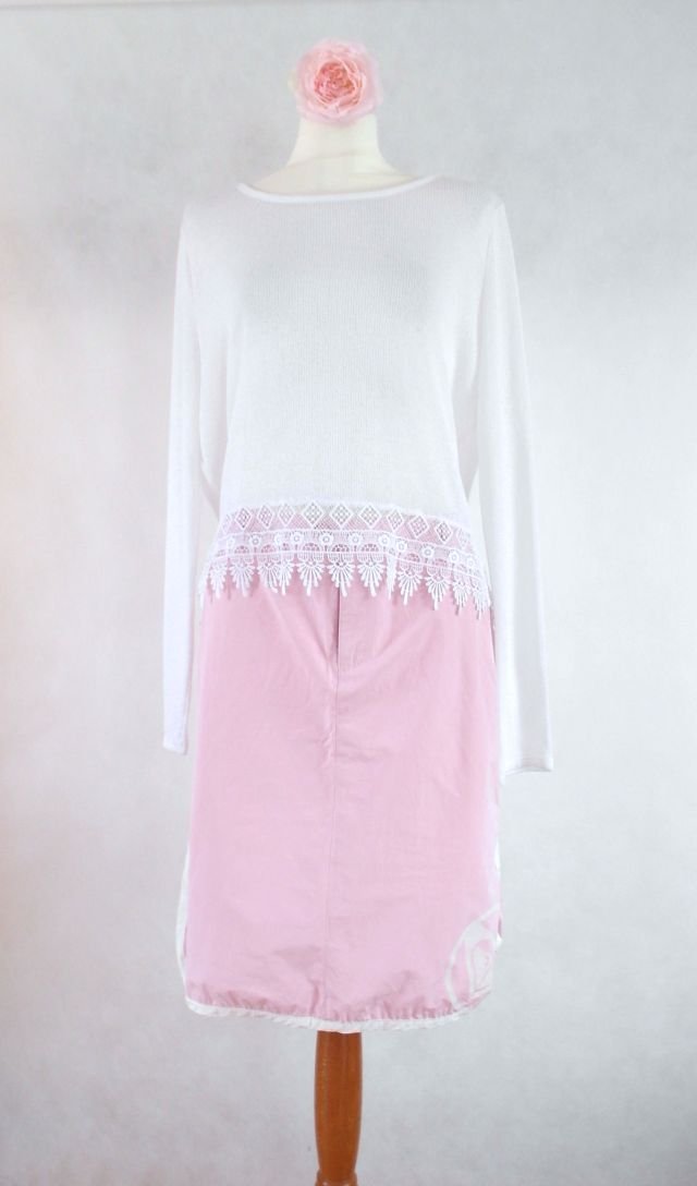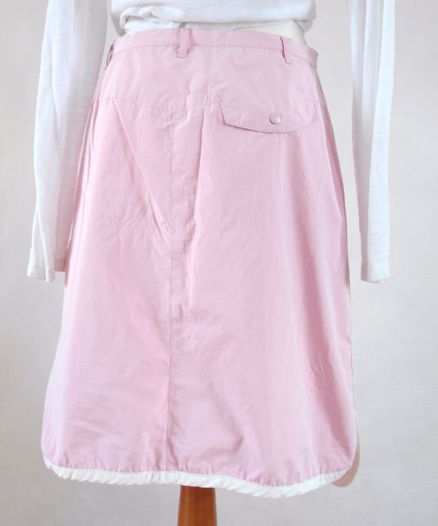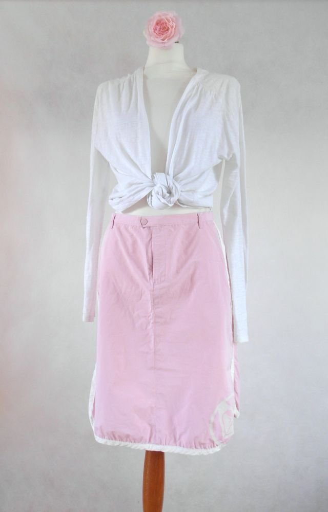 kolor pastelowy róż, obszyta lamówką ecru.Z przodu suwak, z tyłu kieszonka.U dołu logo.Lekko sztywny i "szeleszczący" materiał.