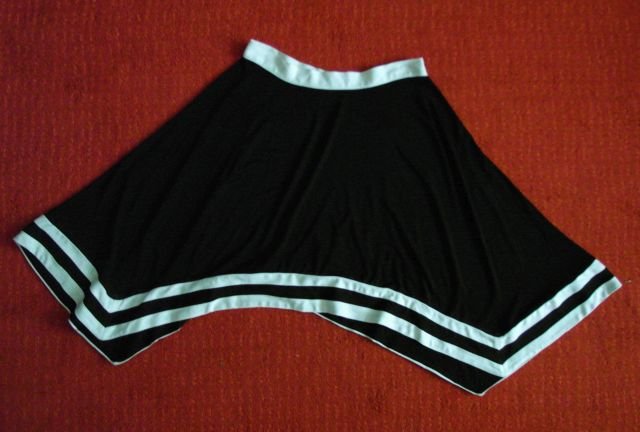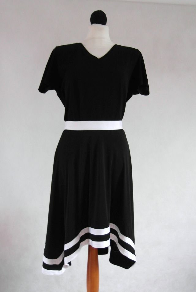 czarna, pas biały, dół również ozdobiony białymi paskami.uszyta z takiej cięższej, śliskiej wiskozy, przez co jest "żywa" i bardzo dobrze się układa.