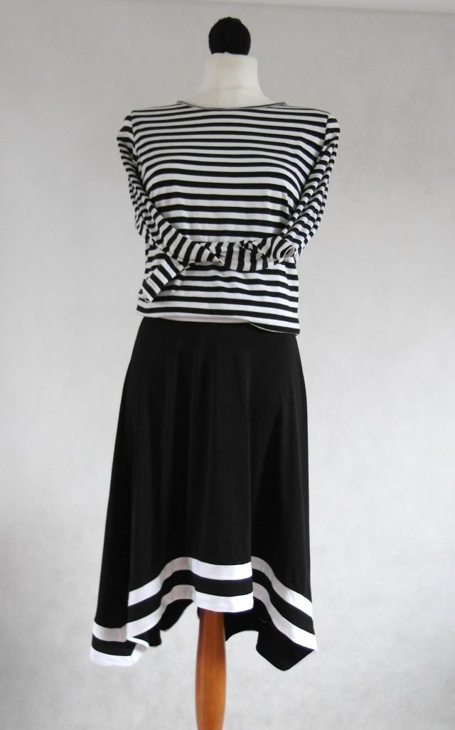 czarna, pas biały, dół również ozdobiony białymi paskami.uszyta z takiej cięższej, śliskiej wiskozy, przez co jest "żywa" i bardzo dobrze się układa.