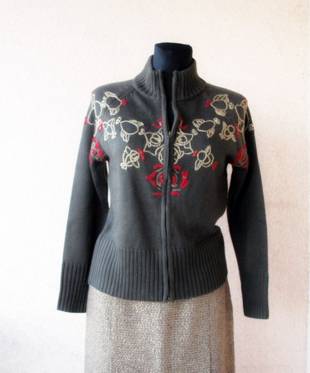 Sportowy sweter marki Intown, ozdobiony haftowanymi aplikacjami. Kolor oliwkowy, zamek podwójny, 100% akryl. Stan bardzo dobry. Rozmiar z metki S, na manekinie o rozmiarze 38. Podaję wymiary mierzone na płasko;