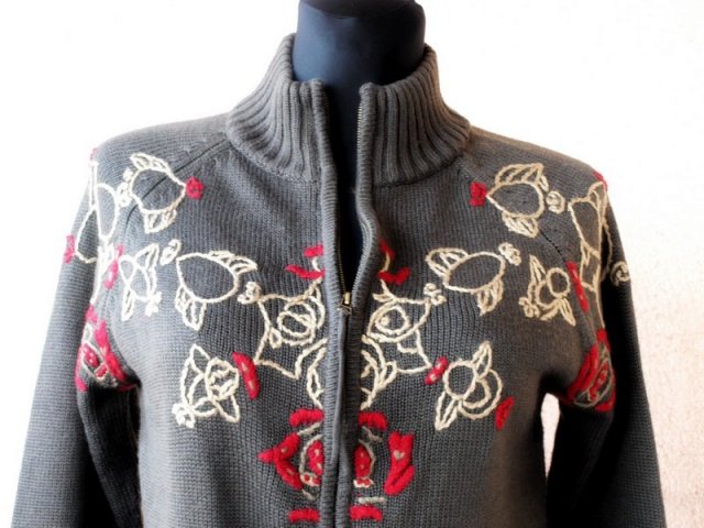 Sportowy sweter marki Intown, ozdobiony haftowanymi aplikacjami. Kolor oliwkowy, zamek podwójny, 100% akryl. Stan bardzo dobry. Rozmiar z metki S, na manekinie o rozmiarze 38. Podaję wymiary mierzone na płasko;