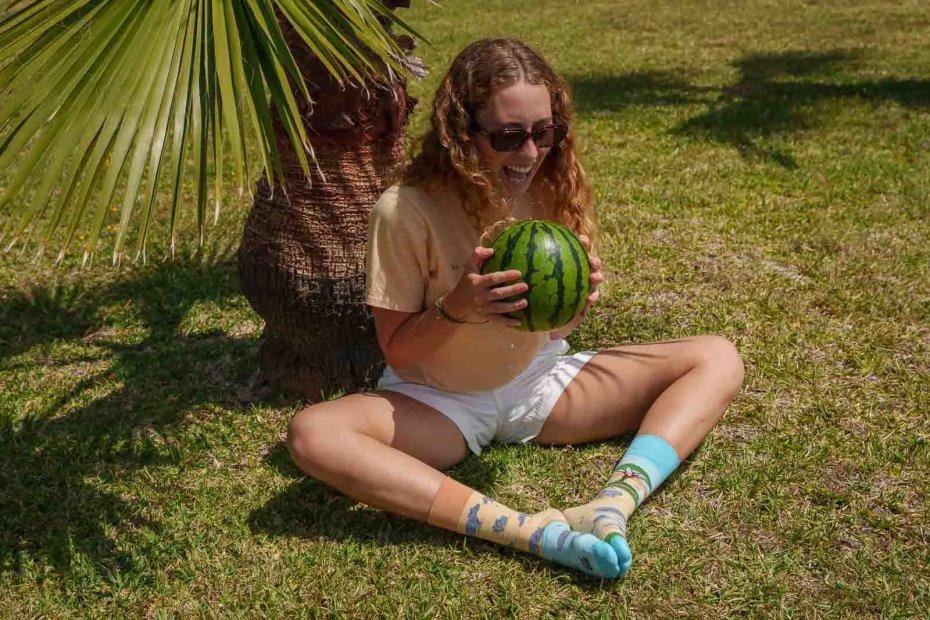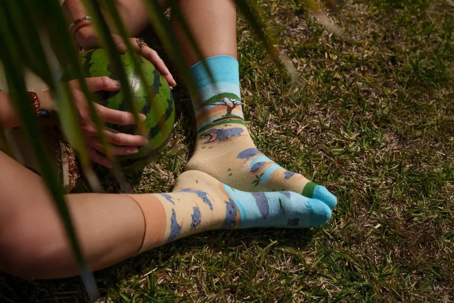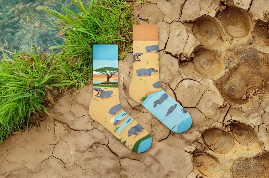 Nie daj się zwieść jego spokojnemu wyglądowi! Hipopotam to prawdziwy władca afrykańskich rzek, jezior i mokradeł. Na naszych skarpetkach uchwyciliśmy go zarówno w momencie błogiego taplania się w wodzie, jak i podczas wędrówki brzegiem. Ciepłe barwy piasku przeplatają się tu z chłodnym błękitem wody, tworząc harmonijną całość, która oddaje klimat afrykańskiego safari.