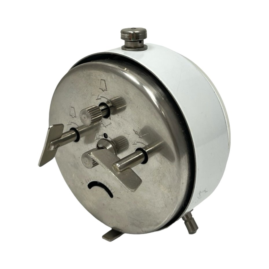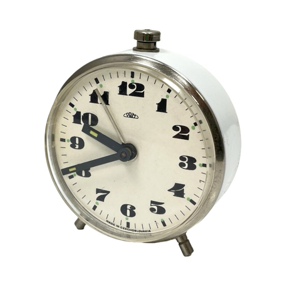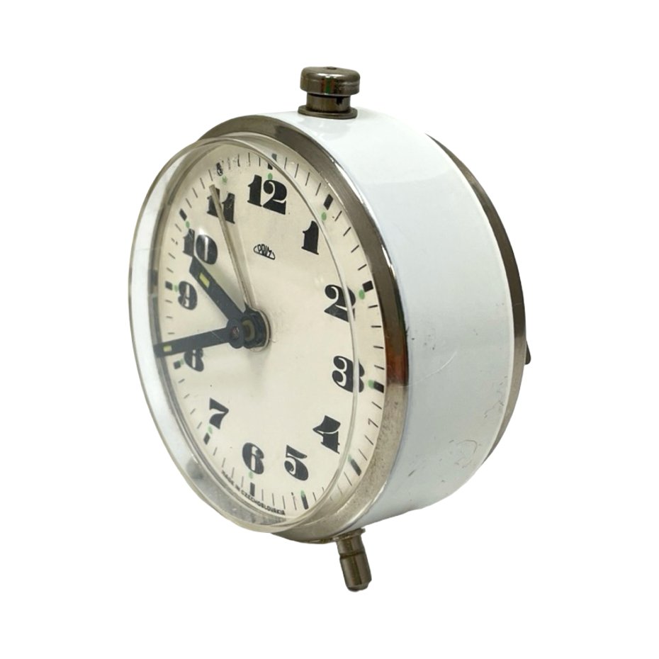 klasyczny mechaniczny budzik czechosłowackiej marki PRIM, ikona wzornictwa z lat 60./70. XX wieku. Model ten jest ceniony za swoją niezawodność i charakterystyczną, czytelną estetykę.