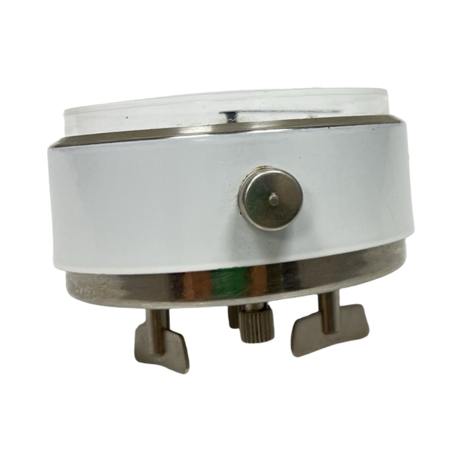 Obudowa: Metalowa, lakierowana na biało. Posiada naturalne odpryski lakieru, zarysowania oraz ślady patyny na złotej ramce i nóżkach, co potwierdza autentyczność przedmiotu.