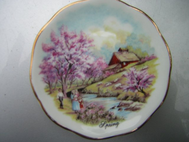 Malutki spodek porcelanowy z reprodukcją Spring. Sygnowany FINE BONE CHINA MADE IN ENGLAND. Pastelowy nadruk, na błyszcząco szkliwiony. Rant falbanowankowy, złocony. Doskonały do kolekcji :) Wiosenna radość i świeżość.