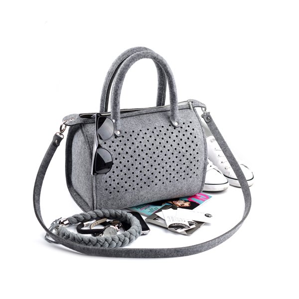 - wzór: kółeczka o średnicy 5 mm wycięte z obu stron torebki - są na tyle małe, że nie widać przez nie co dokładnie znajduje się w środku, ale jednocześnie dodają odrobiny koloru torebce przez znajdujące się w niej rzeczy
