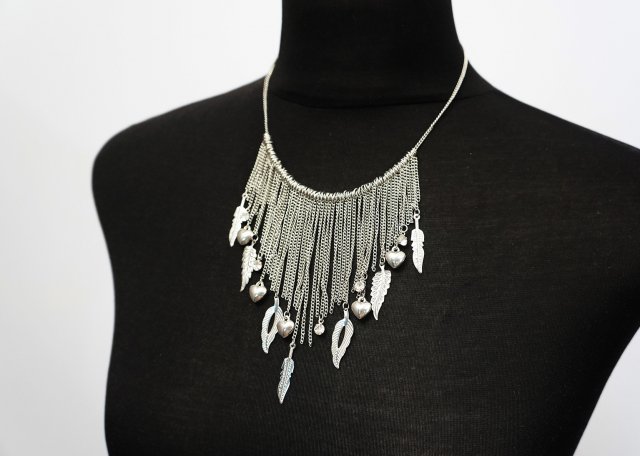 Śliczny naszyjnik wykonany z dużej ilości łańcuszków oraz zawieszek