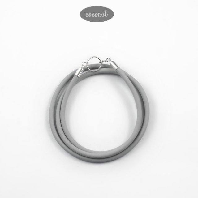 Lekka bransoletka z szarego matowego kauczuku, obwód ok. 17,5 cm (owija się na nadgarstku trzykrotnie), elementy ze srebra. Model unisex.