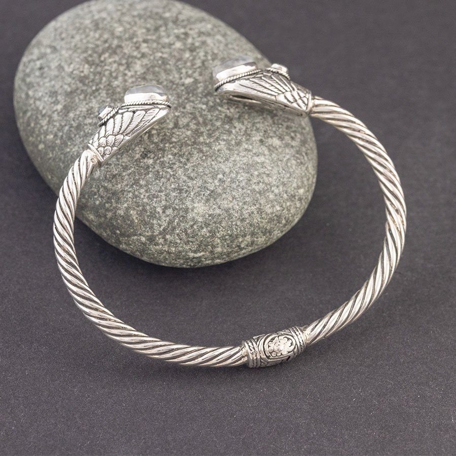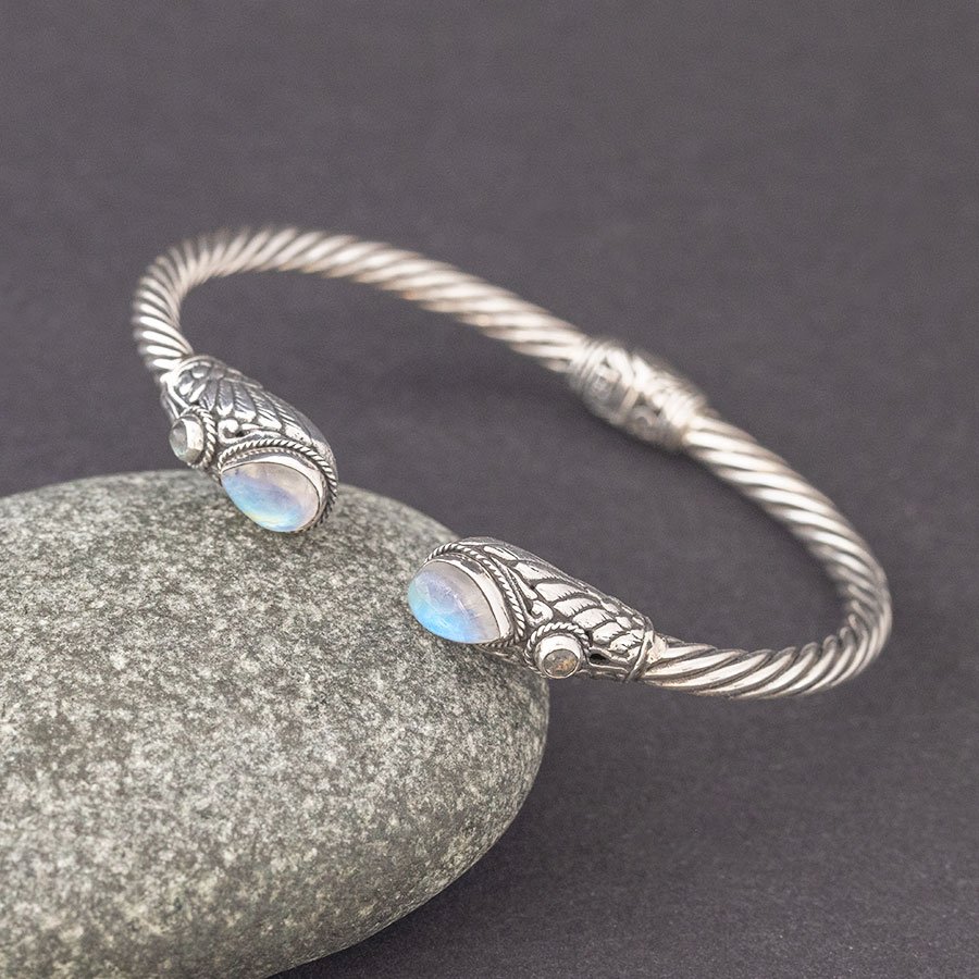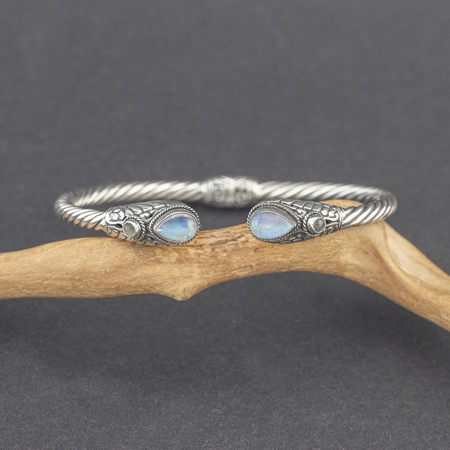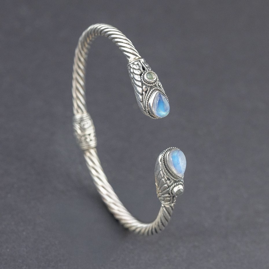 Bransoletka od podstaw wykonana ręcznie ze srebra próby 925. Początek i koniec bransoletki ozdabiają kamienie księżycowe (6x8 mm) oraz labradoryty (3 mm). Szerokość bransoletki 3,5 mm. Element ozdobny umieszczony w centralnej części bransoletki stanowi jednocześnie mechanizm ułatwiający zakładanie i zdejmowanie bransoletki. Bransoletka będzie odpowiednia na nadgarstek o obwodzie 16-17 cm.