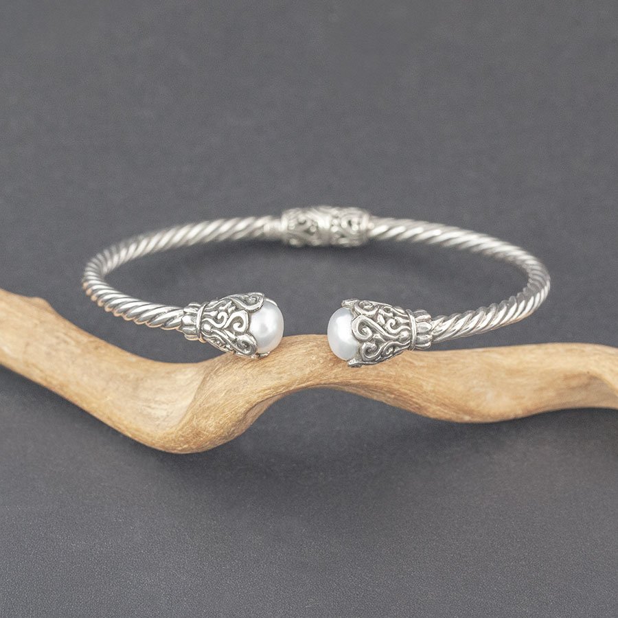 Elegancka bransoletka od podstaw wykonana ręcznie ze srebra próby 925. Początek i koniec bransoletki ozdabiają białe perły słodkowodne. Grubość bransoletki 3,5 mm. Wielkość pereł 8 mm. Element ozdobny umieszczony w centralnej części bransoletki stanowi jednocześnie mechanizm ułatwiający zakładanie i zdejmowanie bransoletki. Bransoletka będzie odpowiednia na nadgarstek o obwodzie 17-17,5 cm.